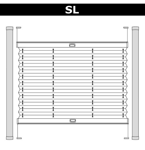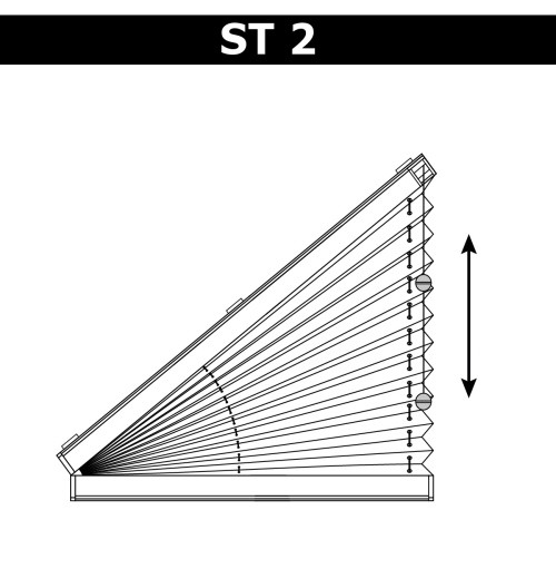 ST2 – система, призначена для вікон складних форм (віконні прорізи та стулки). Може бути рухливою, за умови дотримання правильних розмірів конструкції (висота трикутника не більше ¾ ширини). В системі рухомим може бути тільки нижній профіль, верхній профіль залишається зафіксованим. Механізм управління – шнурової, розташовується у верхньому профілі. За своєю конструкцією нагадує горизонтальні жалюзі. Як і в них, в даній системі механізм розташований у верхньому карнизі, а управління (підняття/опускання полотна) проводиться за допомогою шнура управління. Зафіксувати полотно Ви можете на будь-якому потрібному рівні. |