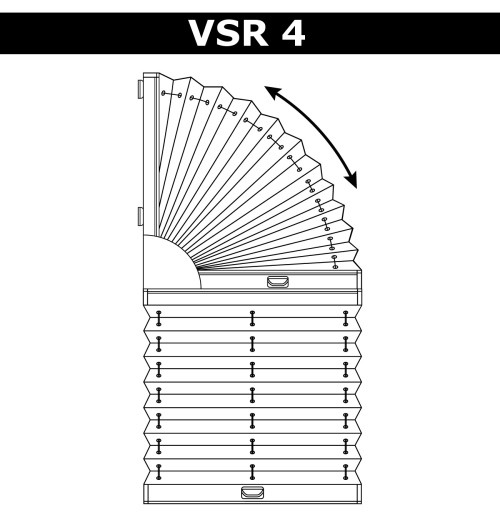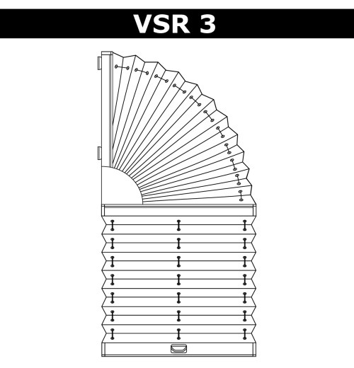 VSR3 – система, призначена для закриття вікон складної форми. Верхня частина конструкції має форму напіварки і залишається нерухомою, а нижня частина – з одним нижнім рухомим профілем. Ручка управління розташовується на рухомому профілі. При ширині понад 80 см – 2 ручки на рухомому профілі. Фіксування верхній частині конструкції відбувається в її центральній частині. |